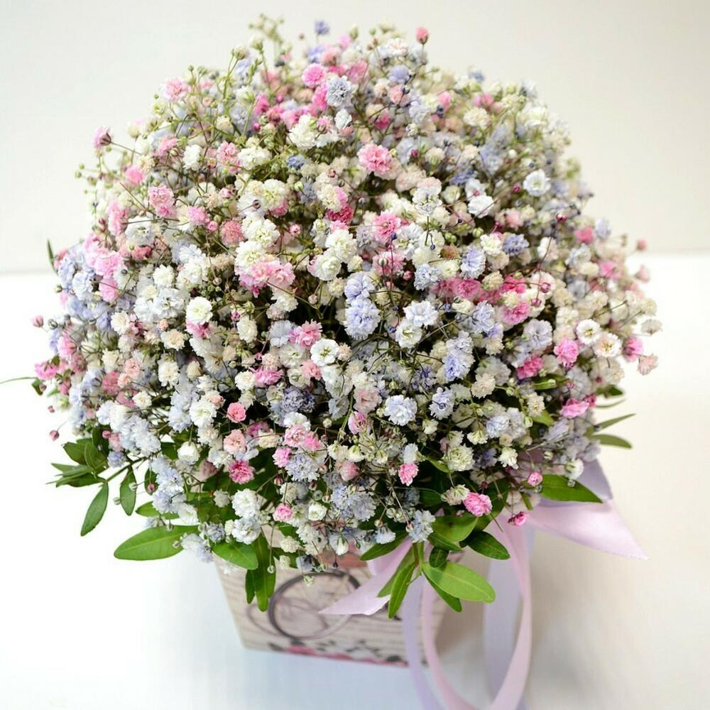“Сиреневый туман” – композиция из гипсофилы в шляпной коробке