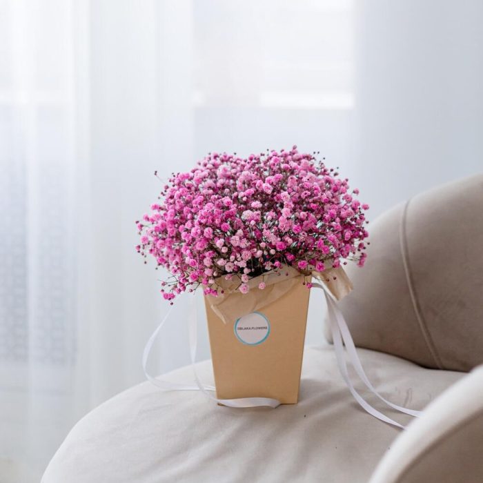 “Сиреневый туман” – композиция из гипсофилы в шляпной коробке