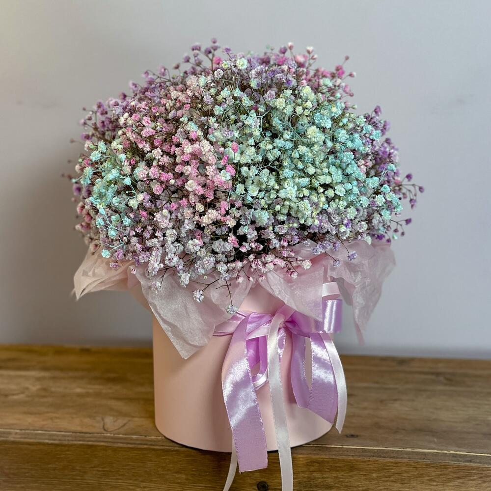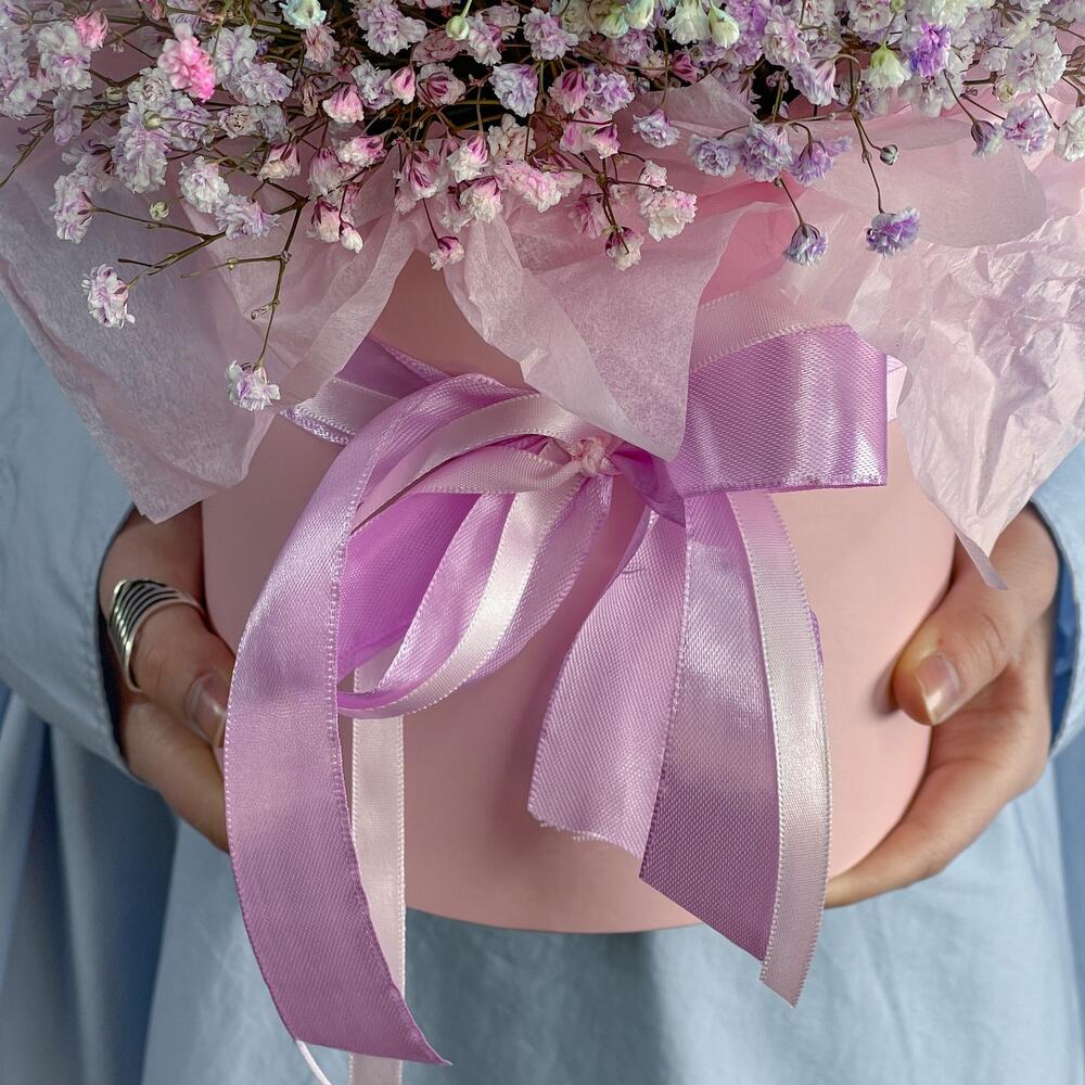 Гипсофила – 6 шт.Лента атласная – 1 шт.Коробка шляпная – 1 шт.