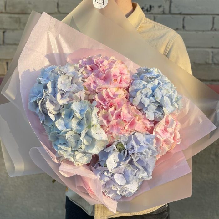 Нежное воздушное облако из микса гортензий Очень объемный букет в воздушной матовой полупрозрачной упаковке