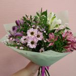Букет с альстромериями, кустовой розой, гвоздикой и ваксфлауэром