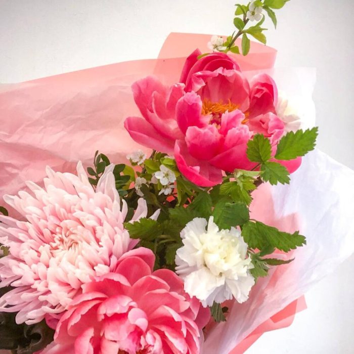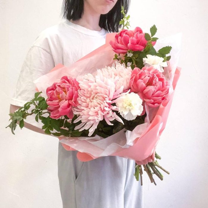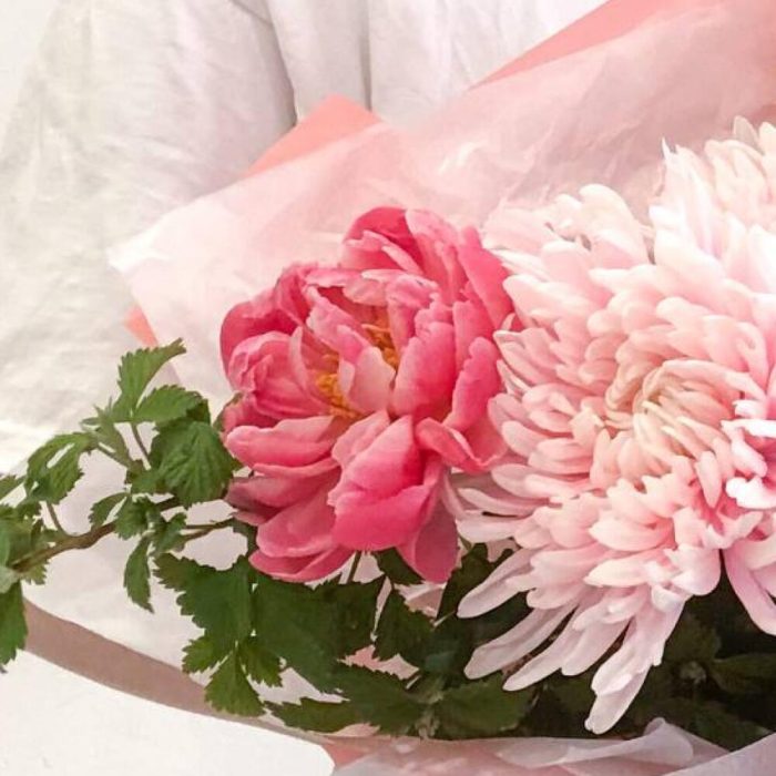 Пион Коралл Шарм (Coral Charm) – 3 шт.Лента атласная – 1 шт.Тишью – 1 шт.Фисташка – 5 шт.Корейская пленка – 3 шт.хризантема антонов крашенный – 2 шт.ветки малины с листьями – 3 шт.даинтус – 4 шт.ветки яблони цветущие – 1 шт.авкапак – 1 шт.
