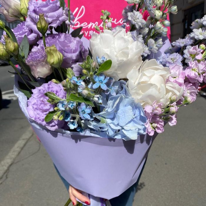 Пион – 2 шт.Гортензия – 1 шт.Дельфиниум – 3 шт.Лизиантус – 2 шт.Оксипеталум – 3 шт.Маттиола – 3 шт.Эвкалипт – 3 шт.Фисташка – 3 шт.Упаковка дизайнерская – 1 шт.