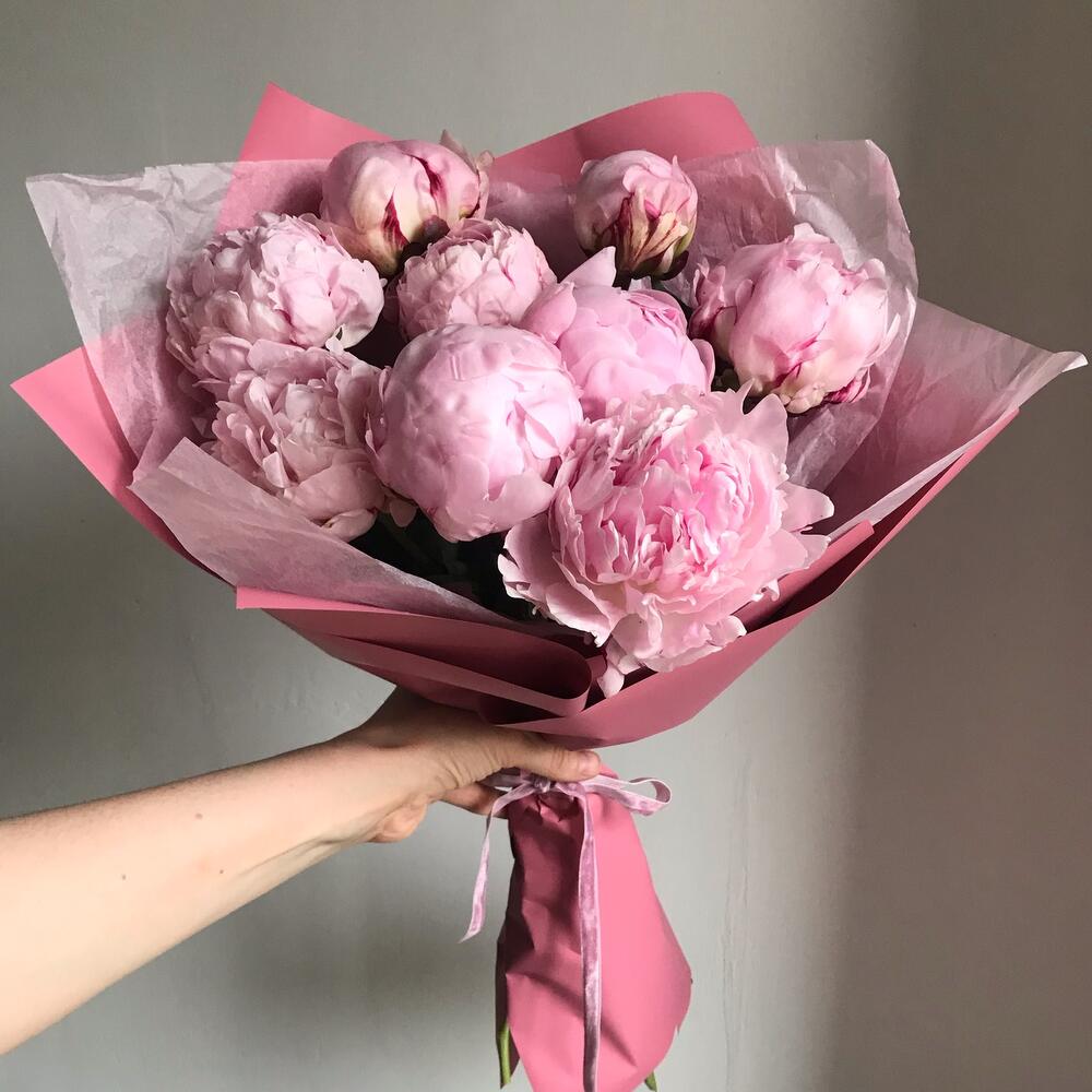 Лента – 2 шт.Пион Сара Бернар – 9 шт.Упаковка дизайнерская – 3 шт.Средство для продления жизни цветов – 2 шт.инструкция по уходу за цветами – 1 шт.
