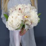Пион – 5 шт.Орхидея Цимбидиум – 7 шт.Рускус – 7 шт.Лента атласная – 3 шт.
