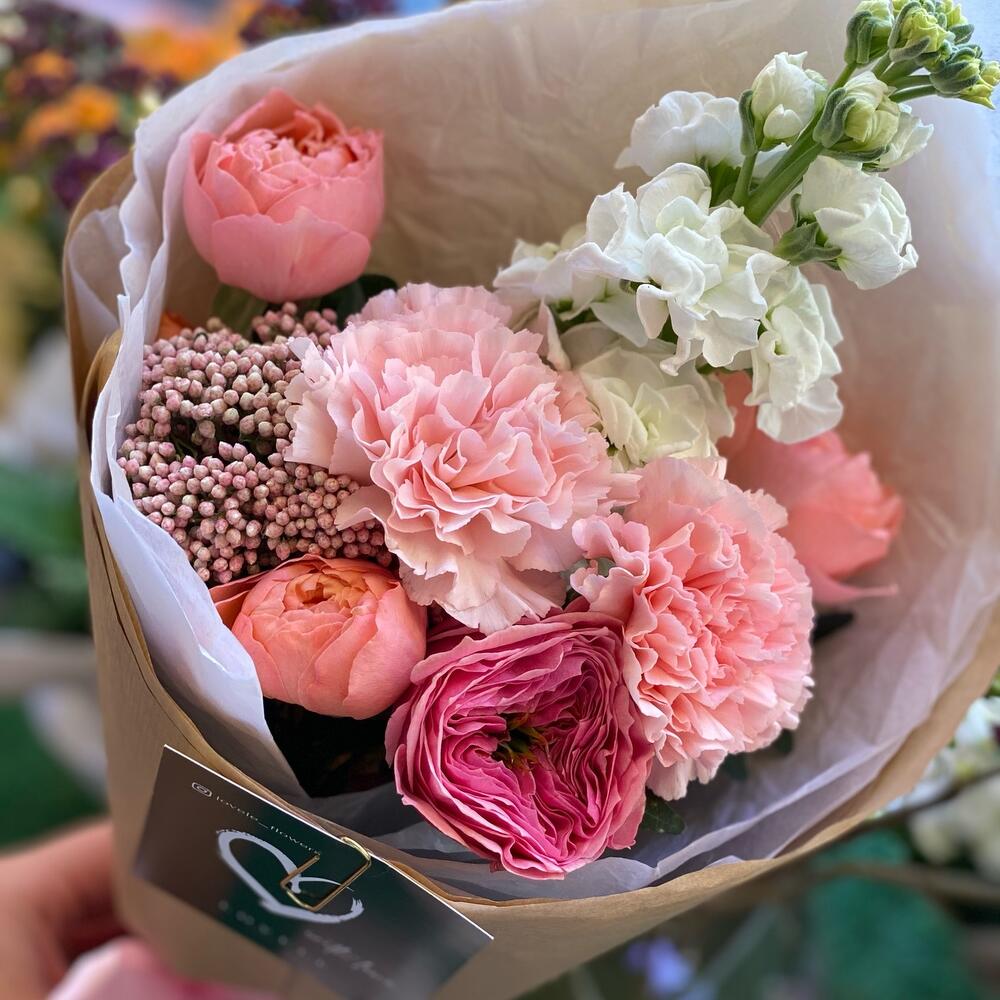 Маттиола белая – 1 шт.Роза кустовая пионовидная – 1 шт.Роза одноголовая – 1 шт.Гвоздика – 2 шт.Озотамнус – 1 шт.Тишью белое – 1 шт.Крафт упаковка – 1 шт.Лента атласная – 2 шт.Открыточка с вашими пожеланиями – 1 шт.Кризал (подкормка) – 1 шт.