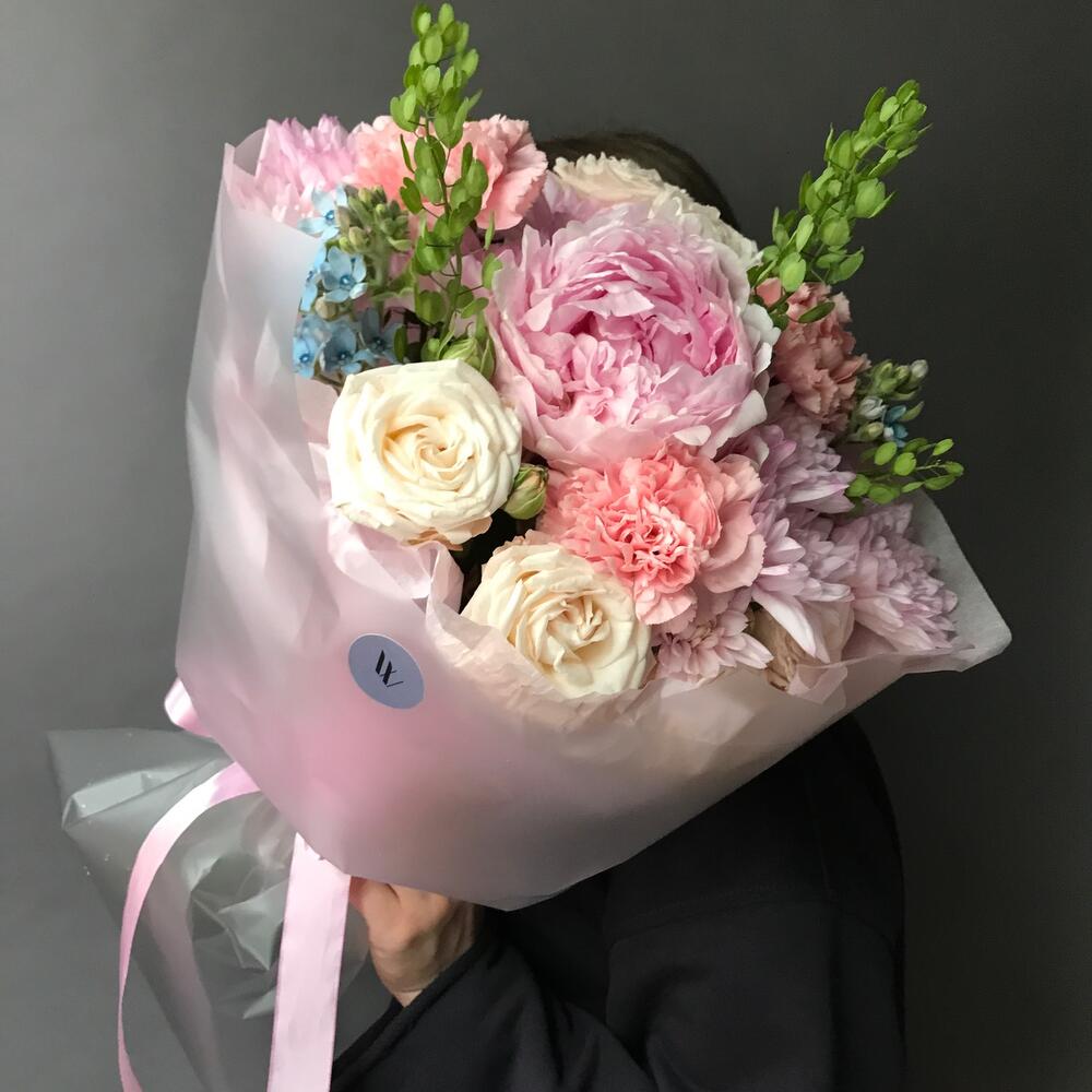 Сборный букет с французскими розами и гвоздикамм в пудровых оттенках