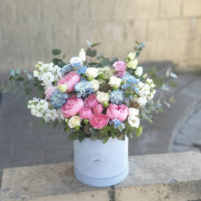 Бархатный цилиндр из голубых диантусов, розовых пионов и ароматной маттиолы