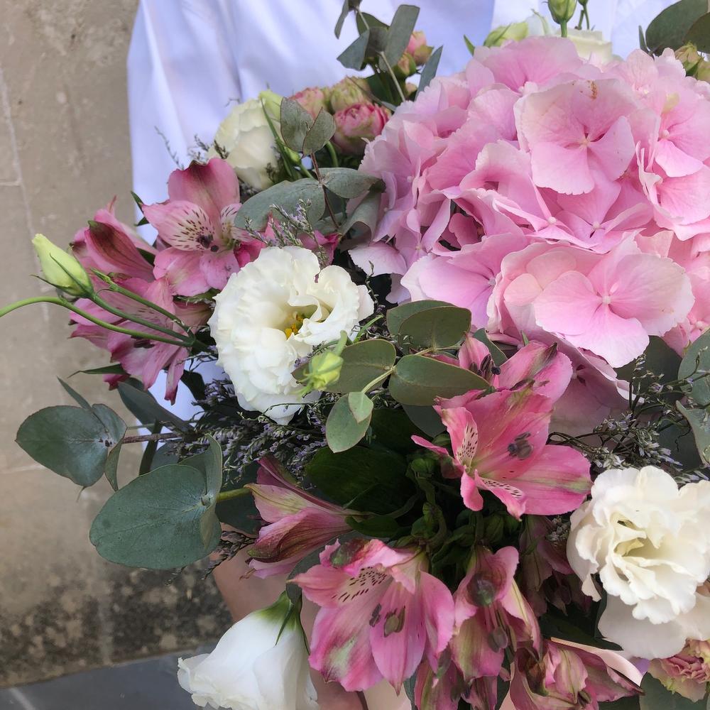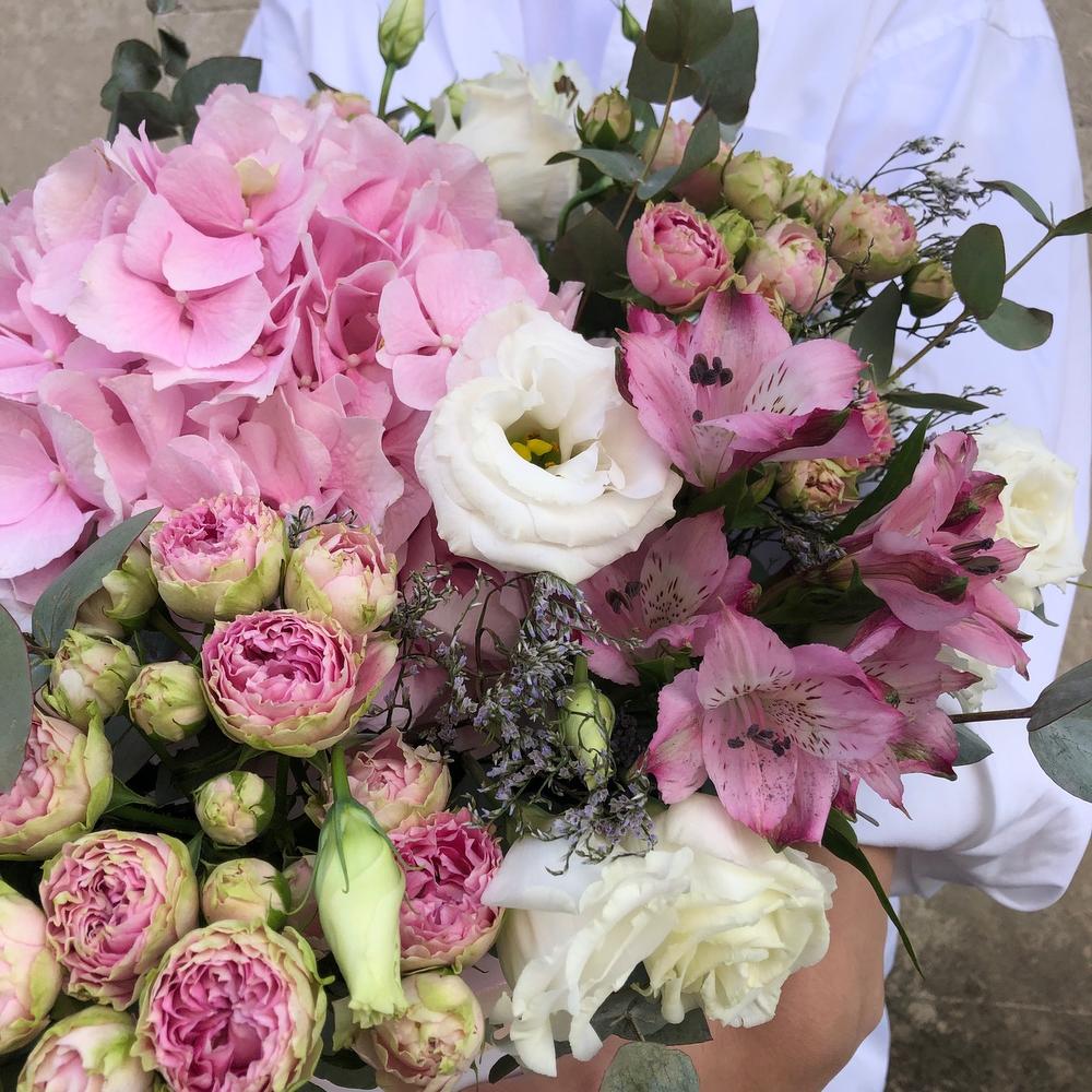 Гортензия розовая – 1 шт.Кустовая роза – 3 шт.эустома или кустовая роза – 3 шт.Альстромерия – 3 шт.Эвкалипт – 3 шт.Лимониум – 3 шт.