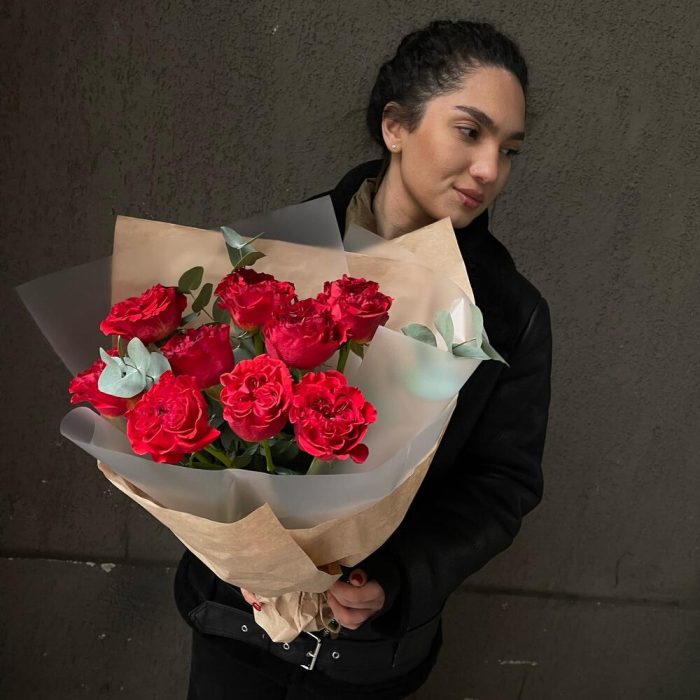 Эвкалипт – 3 шт.Роза пионовидная – 9 шт.Упаковка дизайнерская – 3 шт.