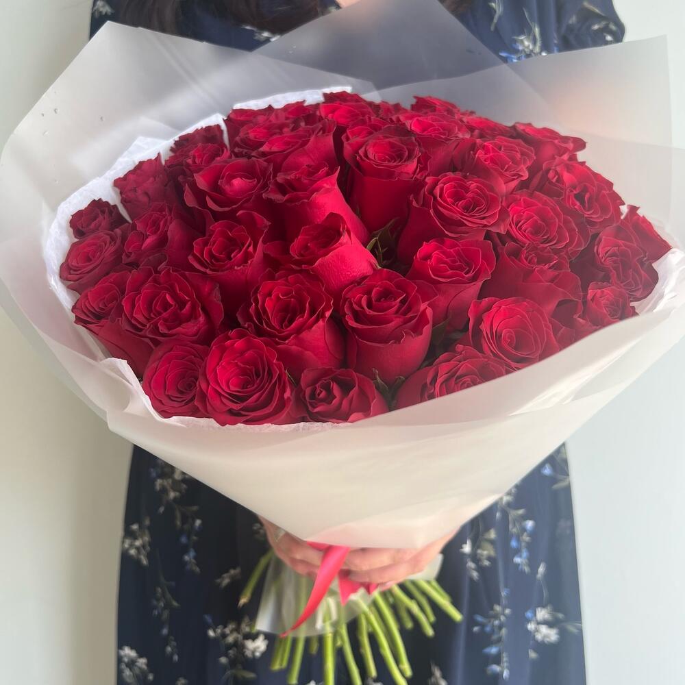Лента атласная – 1 шт.Матовая пленка – 3 шт.Тишью белое – 2 шт.роза 40 см (кения) – 51 шт.