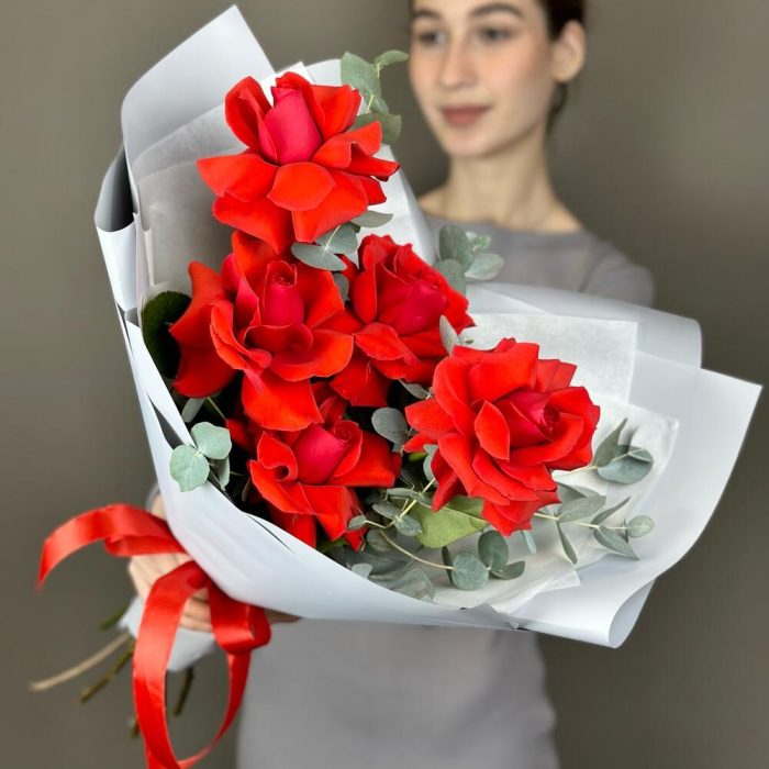 Эвкалипт – 1 шт.Лента атласная – 1 шт.Французская роза – 5 шт.Тишью белое – 1 шт.Дизайнерская упаковка – 1 шт.