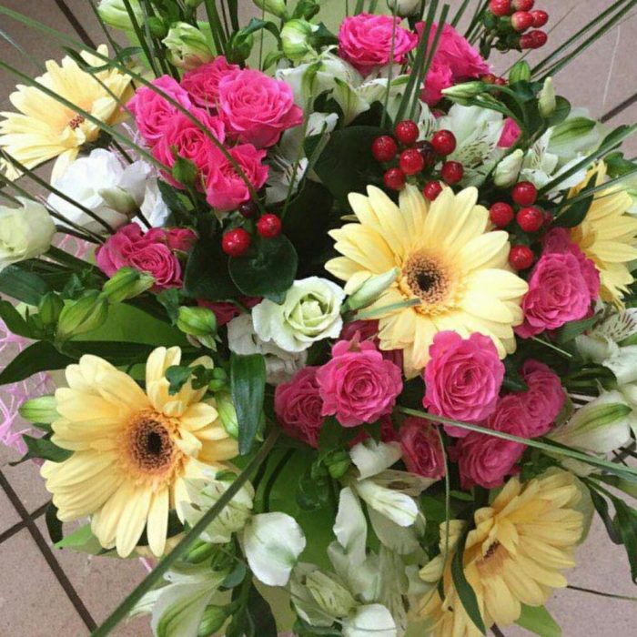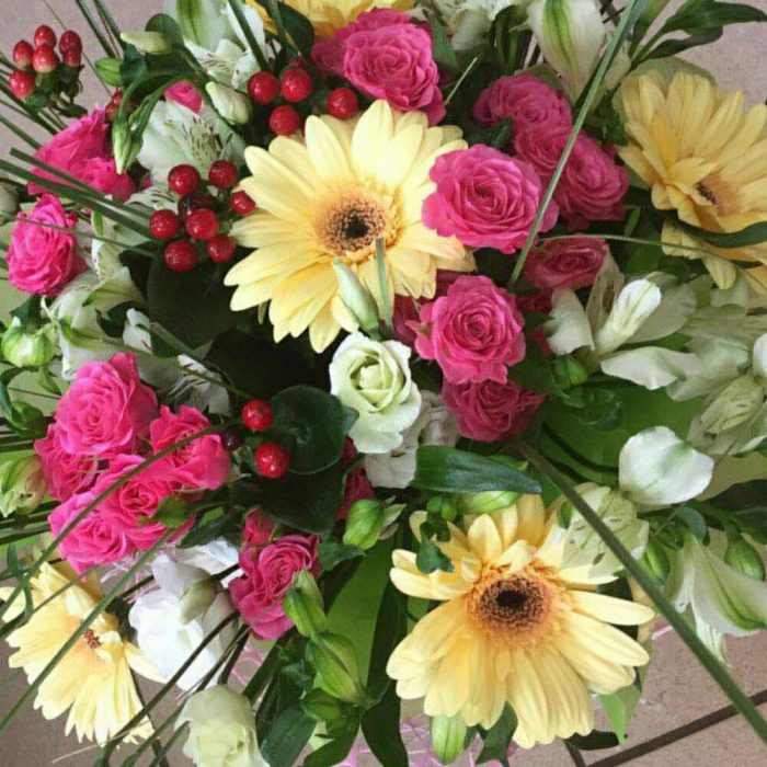 Берграсс – 3 шт. Роза кустовая розовая – 4 шт. Гербера кремовая – 5 шт. Альстромерия Микс Европа – 4 шт. гипериекум – 4 шт. лизаантус белый – 3 шт.