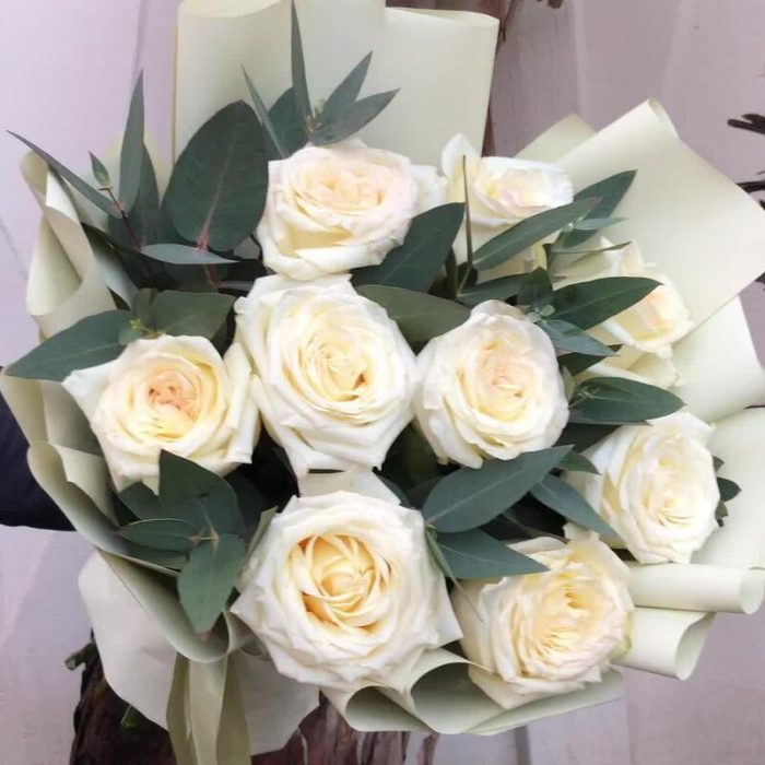 Лента – 2 шт.Эвкалипт – 4 шт.Упаковка дизайнерская – 1 шт.Роза белая эквадор – 9 шт.
