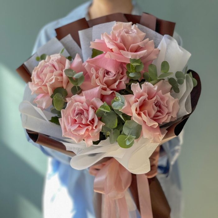 Лента – 2 шт.Эвкалипт – 2 шт.Роза одноголовая – 5 шт.Упаковка дизайнерская – 2 шт.
