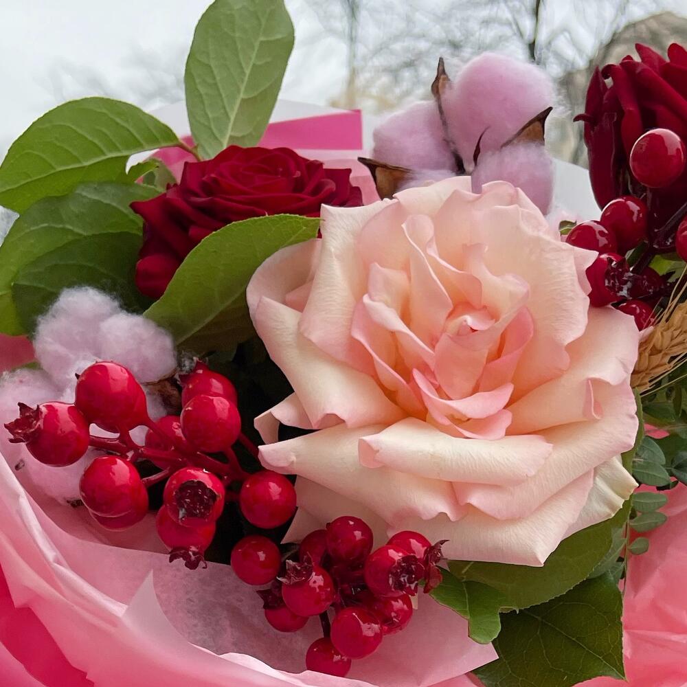 Роза красная – 2 шт.Хлопок – 2 шт.Лента атласная – 4 шт.Тишью – 4 шт.Французская роза – 1 шт.Ягоды декоративные – 3 шт.Пленка матовая – 6 шт.Фисташка пучок – 1 шт.Салал пучок – 1 шт.колосок полевой – 1 шт.