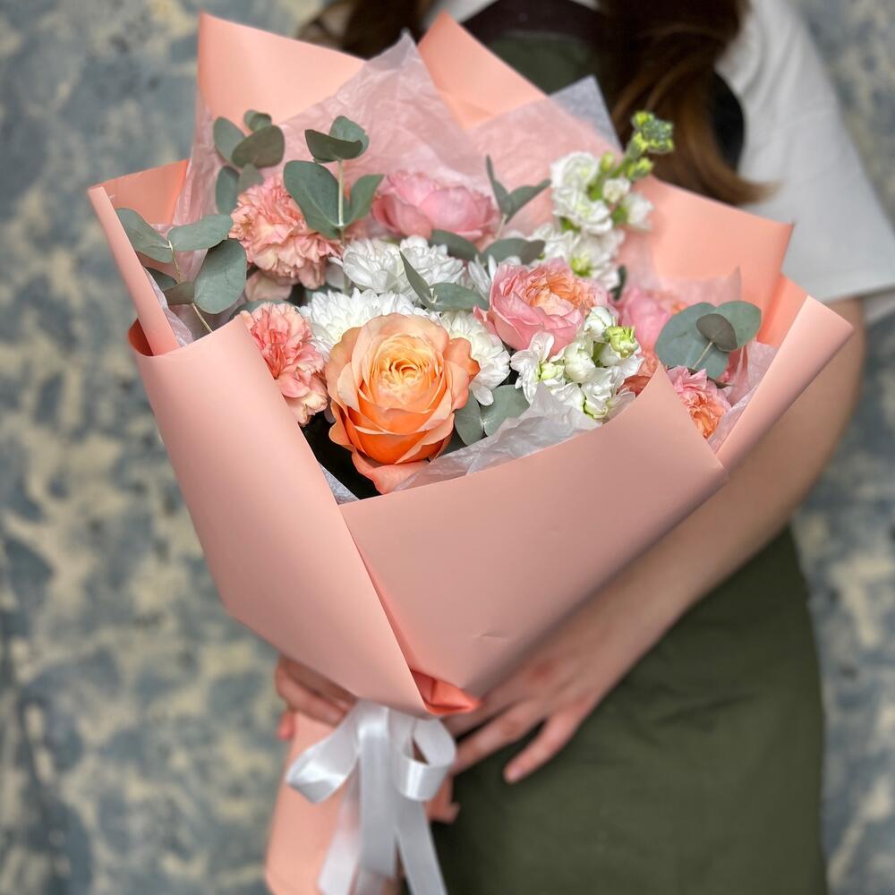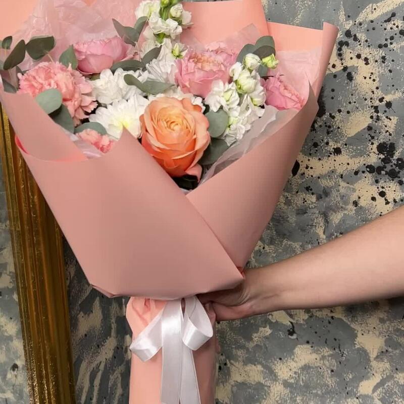 Роза кустовая пионовидная джульетта – 1 шт.Маттиола – 2 шт.Хризантема кустовая – 1 шт.Роза пионовидная кахала – 1 шт.Диантус – 3 шт.Эвкалипт – 3 шт.Тишью белое – 2 шт.Пленка матовая – 5 шт.Лента атласная – 2 шт.