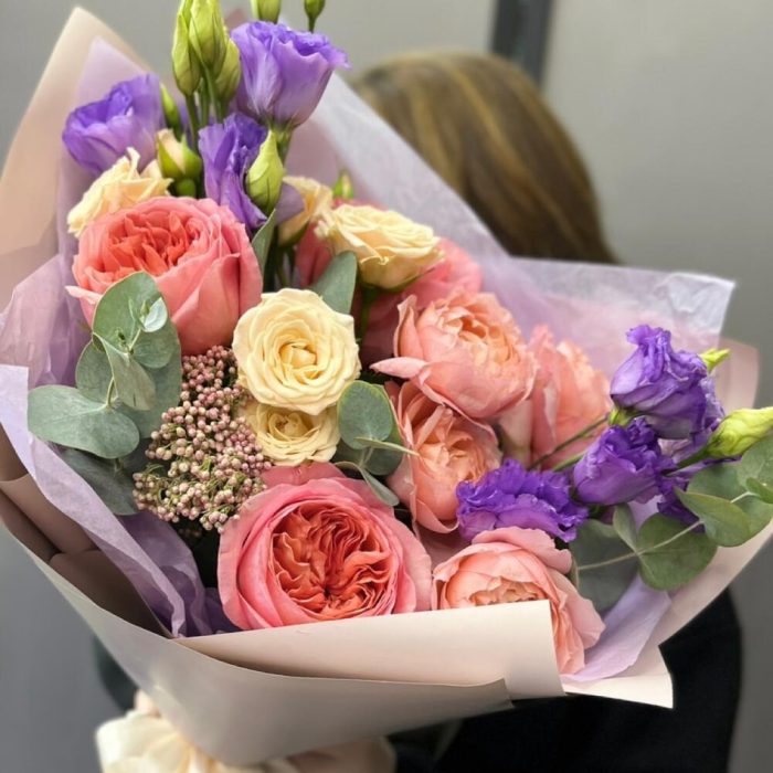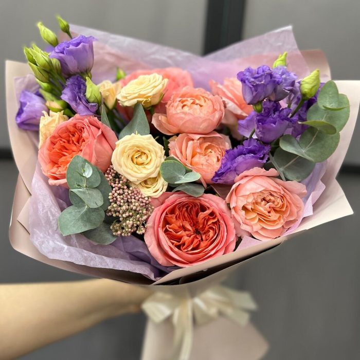 роза кустовая таня – 1 шт.Роза кустовая пионовидная джульетта – 1 шт.роза пионовидная пинк экспрешн – 3 шт.эустома лавандовая – 2 шт.Озотамнус – 1 шт.Эвкалипт – 2 шт.Тишью – 2 шт.Пленка матовая – 3 шт.Лента атласная – 2 шт.