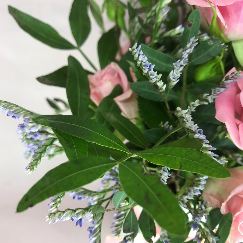 Роза кустовая – 2 шт.Лента атласная – 1 шт.Фисташка – 1 шт.Лимониум сиреневый – 1 шт.стакан кофейный – 1 шт.