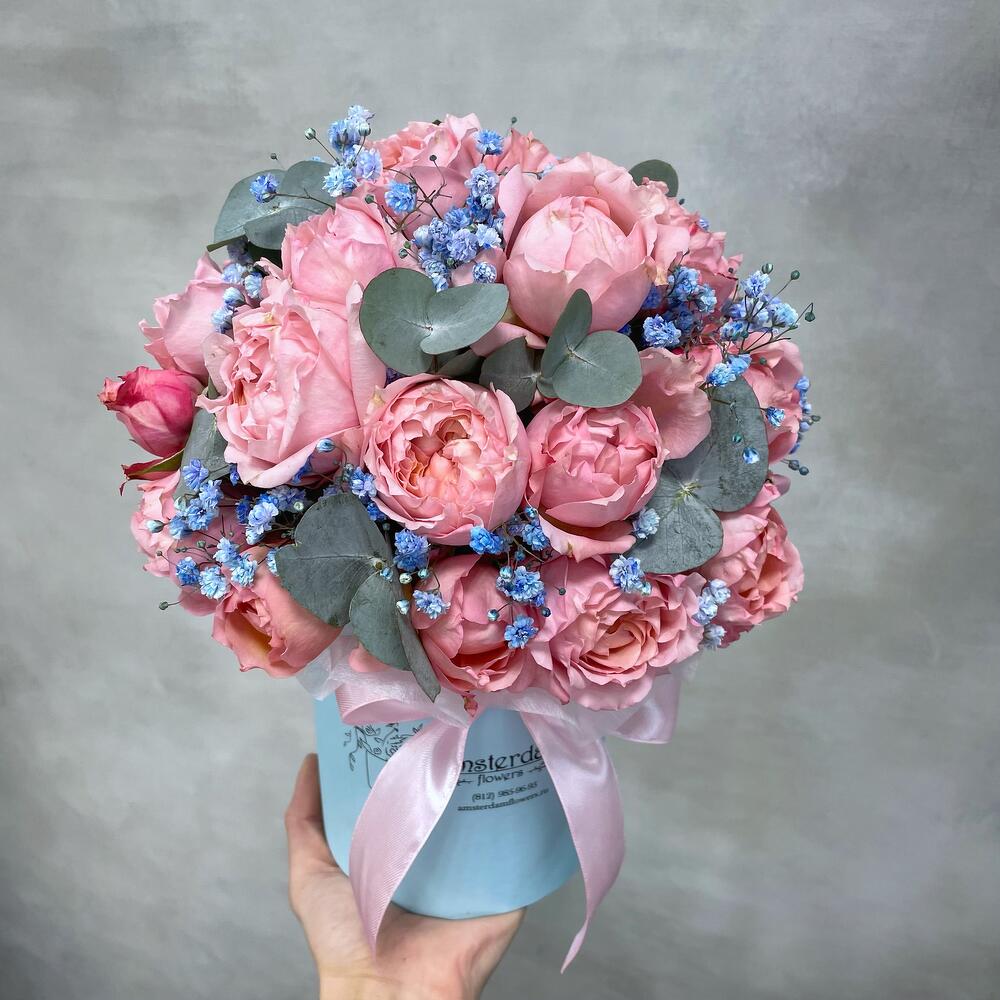 Роза пионовидная Джульетта – 7 шт.Гипсофила голубая – 2 шт.Эвкалипт – 2 шт.Коробка d12 – 1 шт.Оазис – 1 шт.