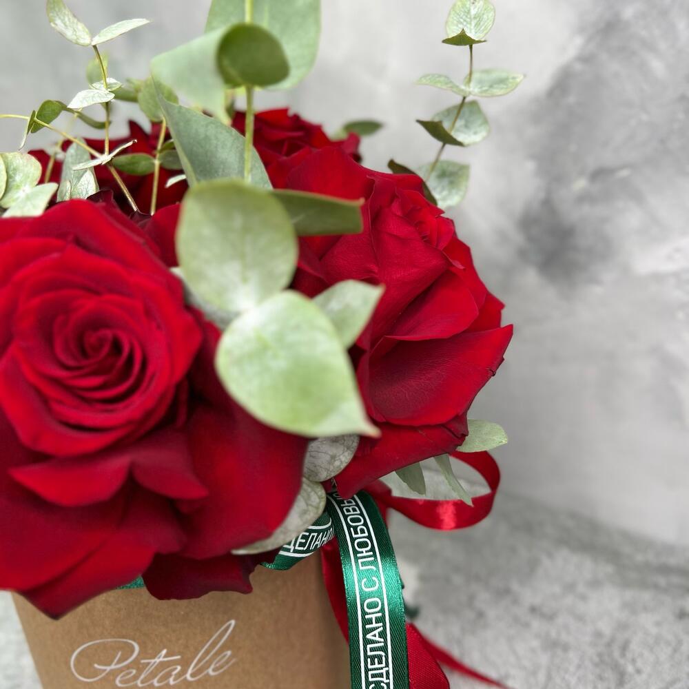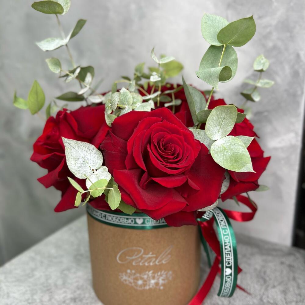 Эвкалипт – 3 шт.Роза Эквадор – 5 шт.Лента атласная – 2 шт.Коробка шляпная – 1 шт.Оазис флористический – 1 шт.