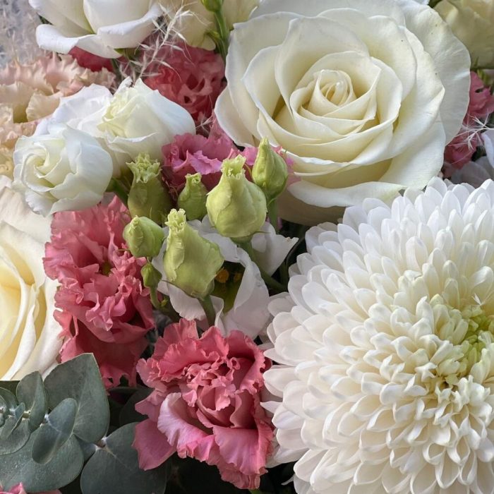 Маттиола – 1 шт.Хризантема – 1 шт.Тишью – 1 шт.Коробка шляпная – 1 шт.Роза Мондиаль – 4 шт.эустома розовая – 3 шт.Эвкалипт Микс – 4 шт.Оазис флористический – 2 шт.эустома белая – 4 шт.пампасная трава – 2 шт.