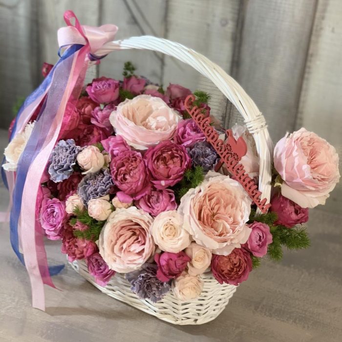 Роза пионовидная – 7 шт.роза пионовидная кустовая «джульетта сериз» – 3 шт.роза пионовидная кустовая «джульетта принцесса» – 5 шт.роза кустовая пионовидная «бомбастик» – 5 шт.Диантус сортовой – 11 шт.Аспарагус – 3 шт.Оазис флористический – 2 шт.Корзина плетеная – 1 шт.Лента – 7 шт.