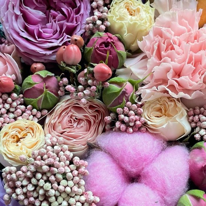 “Атлас☁️” – цветочная композиция с зефиром в деревянном ящике