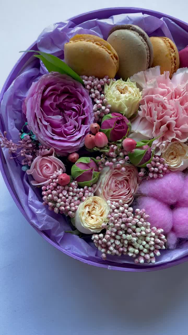 Гиперикум – 1 шт.Хлопок – 1 шт.Кустовая роза – 3 шт.Гвоздика – 1 шт.Коробка шляпная – 1 шт.Оазис флористический – 1 шт.макарон (пирожное) – 4 шт.райз – 1 шт.