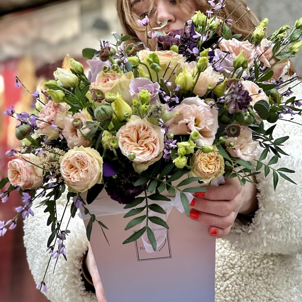 Роза кустовая пионовидная – 3 шт.Роза пионовидная – 2 шт.Роза лавандовая – 4 шт.Лизиантус алиса – 4 шт.Джинстер – 4 шт.Эвкалипт – 4 шт.цветы микс – 4 шт.зелень микс – 4 шт.Коробка – 1 шт.Флористическая губка – 1 шт.Фисташка – 3 шт.Лента – 1 шт.