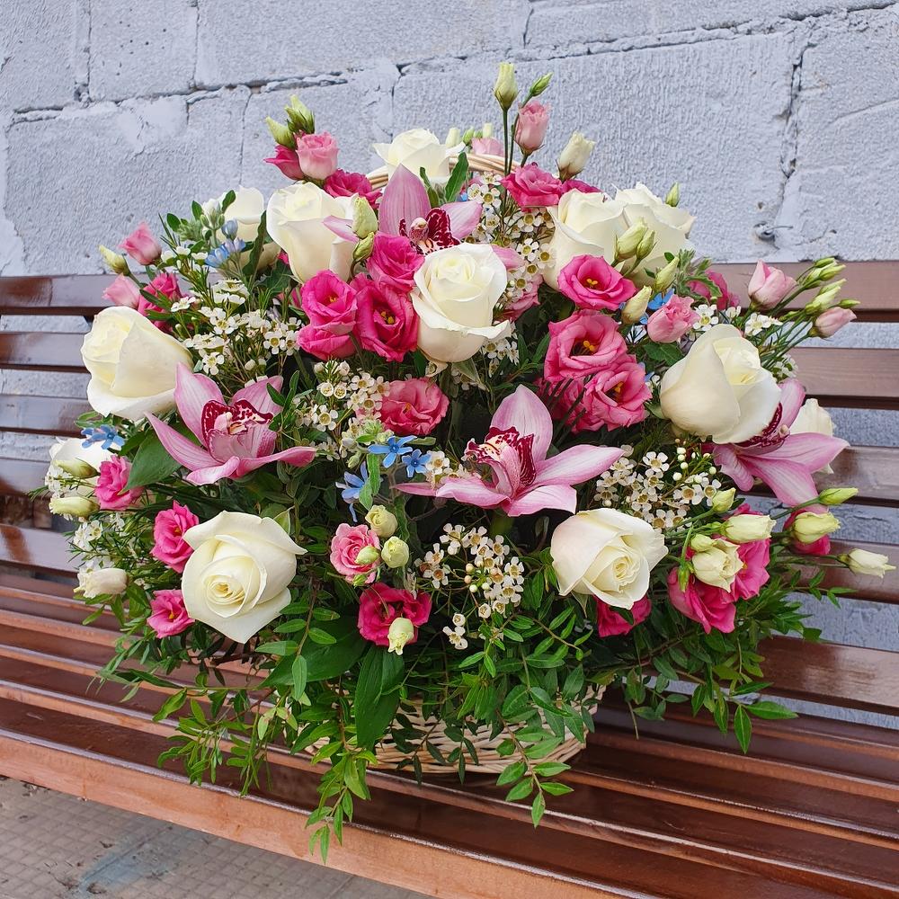 Орхидея Цимбидиум – 12 шт.Лизиантус – 10 шт.Роза – 19 шт.Оксипеталум – 11 шт.Ваксфлауэр – 4 шт.Фисташка – 5 шт.Рускус – 10 шт.Оазис флористический – 2 шт.Корзина плетеная – 1 шт.