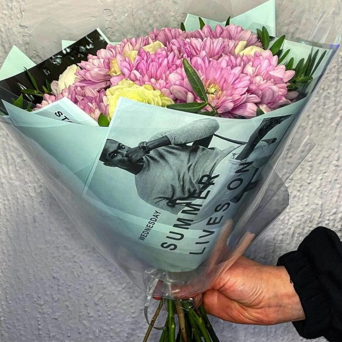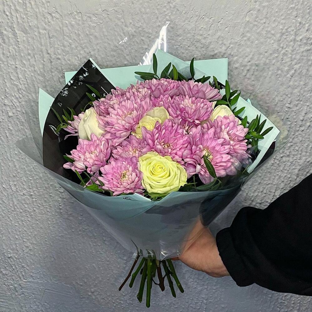 Хризантема кустовая – 4 шт.Роза Эквадор – 5 шт.фисташка зелень – 4 шт.Упаковка дизайнерская – 2 шт.