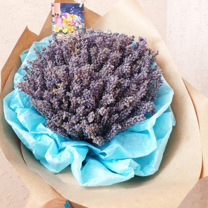 Лаванда (сухоцвет) – 150 гр.Лента атласная – 2 шт.Крафт упаковка – 1 шт.Открыточка с вашими пожеланиями – 1 шт.тишью бирюзовое – 3 шт.