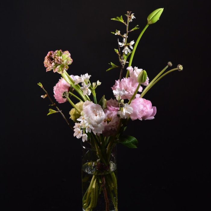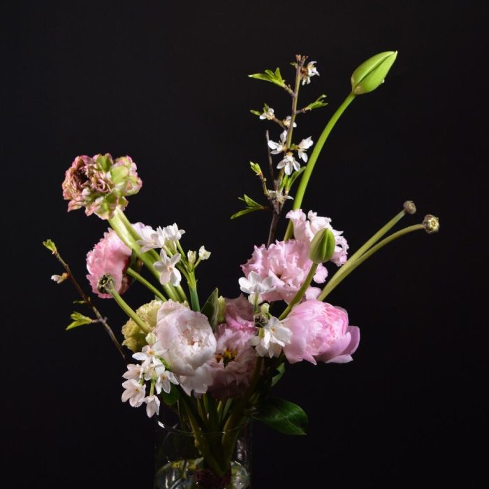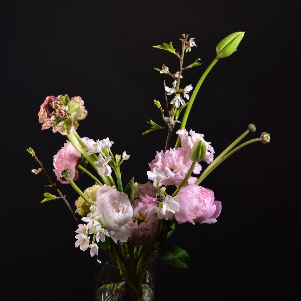 Пион – 3 шт.Ранункулюс – 1 шт.ветка цветущая – 1 шт.Нарцисс – 3 шт.Тюльпан – 2 шт.Лизиантус – 2 шт.